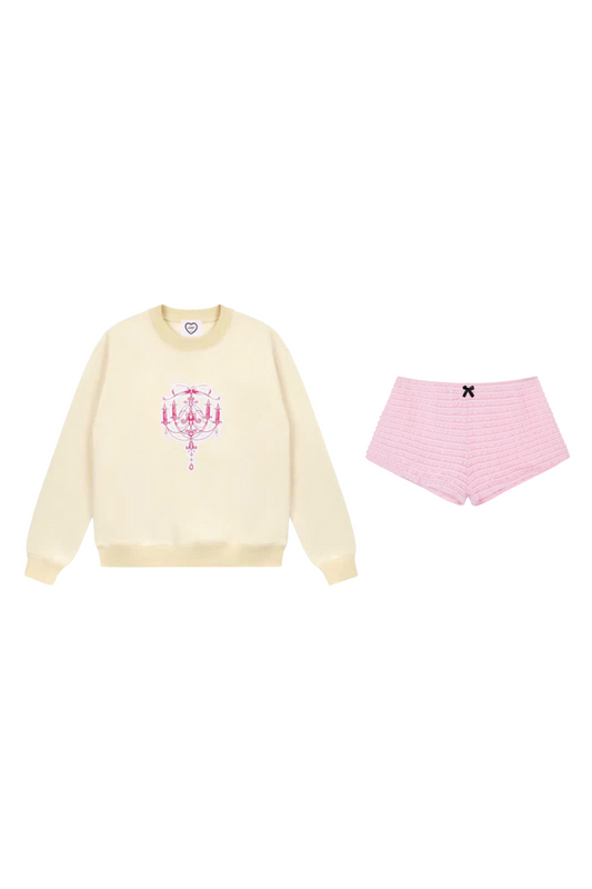 White “Chandelier” sweater + baby shorts